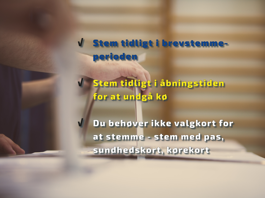 - Husk at medbringe gyldigt ID, for eksempel kørekort, pas eller sundhedskort. Du skal ikke medbringe valgkort.